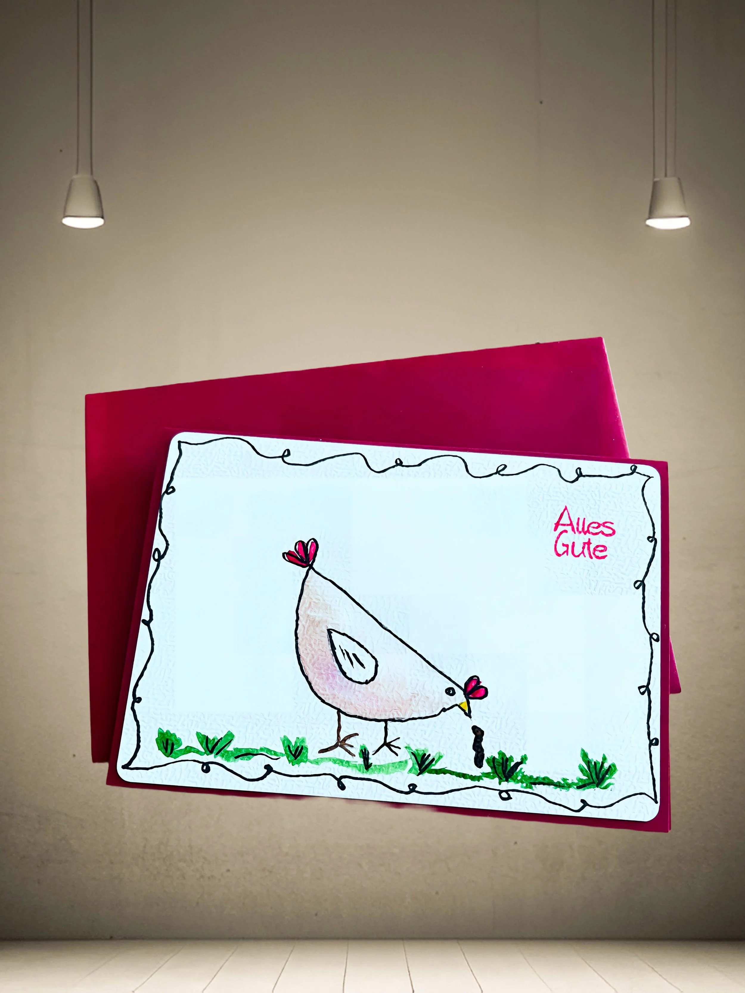 Jede Karte wird von mir mit viel Liebe zum Detail hergestellt, ich verwende dafür Stempel, Stanzschablonen, oder auch Bilder, die ich, oder meine Familie gemacht haben. Das Huhn habe ich gemalt.